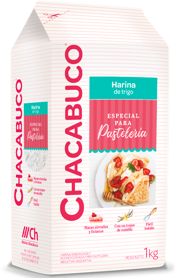 La harina Chacabuco® especial para pastelería es obtenida a partir de la cuidadosa selección de nuestros mejores trigos. Su refinada calidad la hace ideal para la elaboración de masas aireadas y livianas. Sabor garantizado. No necesita esencias. Te permite batir fácilmente todos los ingredientes. Para usar en la elaboración de cualquier receta dulce: tortas, bizcochuelos, budines, roscas, pan dulce, masas secas, tartas, muffins, waffles, panqueques y otras ricas preparaciones. No contiene leudante. No contiene lactosa.