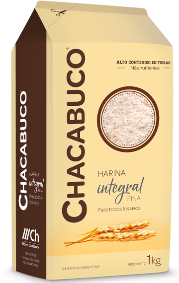 La harina Chacabuco® integral fina es obtenida a partir de la cuidadosa selección de nuestros mejores trigos. Es un producto natural que conserva todas las propiedades nutricionales del grano entero. Permite su uso en toda clase de elaboraciones como pastas frescas, tapas de tartas y empanadas, panes, pizzas y elaboraciones dulces.
