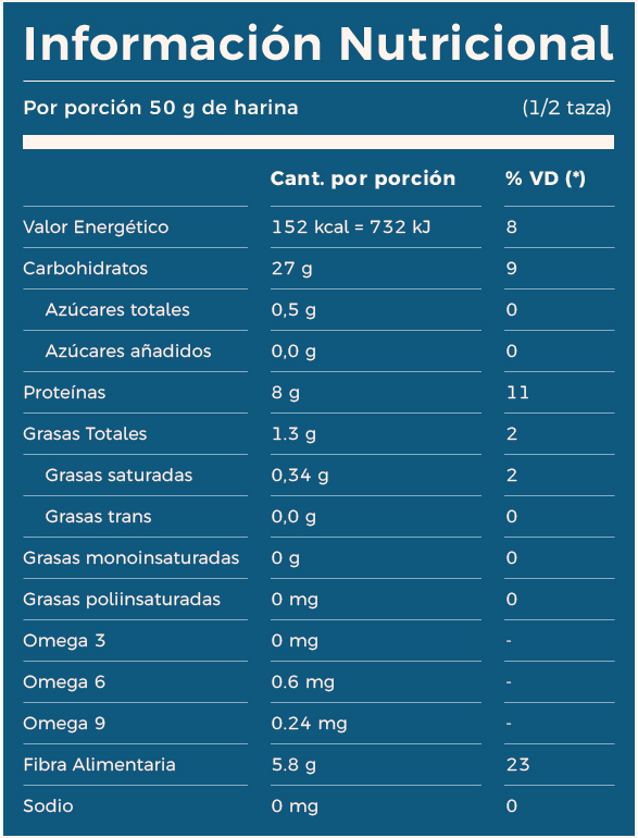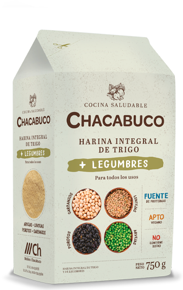 La harina integral de trigo y de legumbres Chacabuco® de la línea Cocina Saludable, es una harina integral de trigo combinada con harina de cuatro diferentes legumbres: garbanzos, arvejas, lentejas y porotos; que en conjunto aportan beneficios nutricionales: tiene 35 % más de proteína vegetal que la harina 000 común, alto contenido de fibra cubriendo el 23 % de la dosis diaria recomendada y un 25 % menos de carbohidratos. Además es baja en grasas totales. No contiene sodio agregado y es un alimento 100 % vegetal, apto para una alimentación vegetariana o vegana.