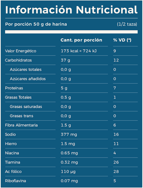 Harina de trigo 000 enriquecida según ley 25630 (*), sal y leudantes químicos INS 500ii y INS 541i.