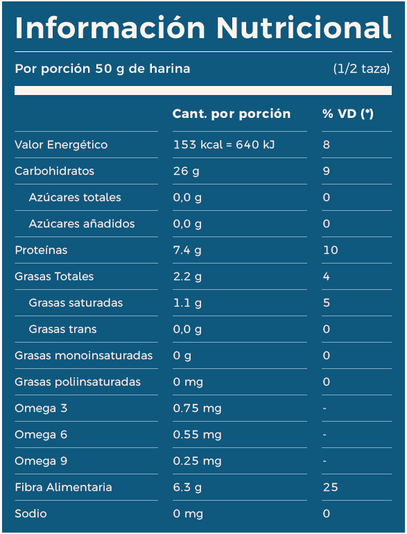 Harina de trigo tipo 000 enriquecida según ley 25630, complejo vitamínico (*), harina de quinoa, semillas de amaranto molidas, harina de trigo sarraceno parcialmente descascarado y con cáscara.