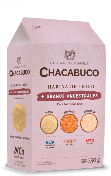 La harina de trigo y de granos ancestrales Chacabuco® de la línea Cocina Saludable es una harina de trigo combinada con harina de quinoa, harina de trigo sarraceno y semillas de amaranto molidas, que en conjunto aportan beneficios nutricionales. Los granos ancestrales son un grupo de semillas y pseudocereales que no han sido alterados o modificados genéticamente durante los últimos milenios. Además de su alto contenido de fibras solubles e insolubles, el trigo sarraceno es un superalimento rico en hidratos de carbono complejos, proteínas, magnesio, potasio y fósforo. Por otro lado la harina de quinoa, que es considerada el único alimento del reino vegetal que provee todos los aminoácidos esenciales. Así como también el amaranto, que también es considerado un superalimento ya que contiene 8 de los 9 aminoácidos esenciales, además de ser fuente de vitaminas A, B, C, B1, B2, B3, D y K y rico en hierro y ácido fólico. Además, no contiene sodio agregado y es un alimento 100 % vegetal, apto para una alimentación vegetariana o vegana.